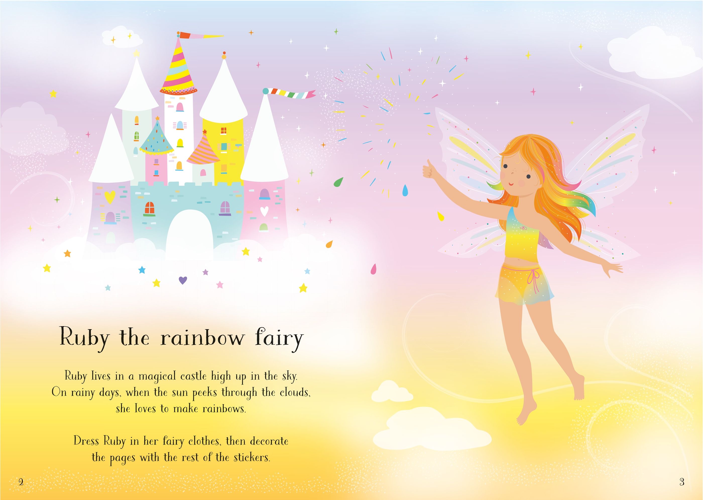 Follow Ruby the Rainbow Fairy as she flutters around Fairyland in this enchanting sticker book.There are lots of magical scenes to decorate, from an orange grove and yellow meadow to painting rainbows in the sky. With over 200 stickers of outfits, animals and flowers to dress the dolls and decorate the pages.
