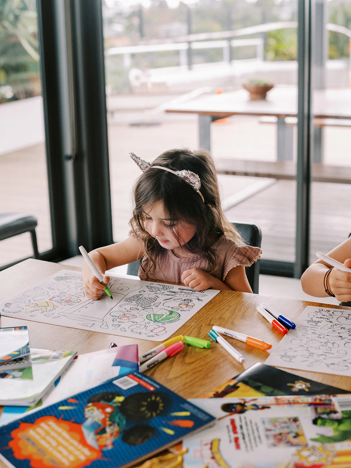 An A3 reusable silicone mat 9 markers for hours of colouring A handy carry pouch (so you don’t lose anything while on the go!) Each mat is thoughtfully designed and features an educational theme (ie space, letters, farm animals, numbers) so your curious kids can learn as they trace, draw and colour!