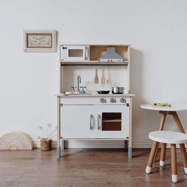 • All-in-one Wooden Kitchen Playset which includes cooking facilities like the stove, microwave, sink, cabinets, shelf, range hood and etc