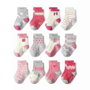 Pink Polka & Stripe Anti-Slip Kids Socks for 1-5 Years (12 Pairs)