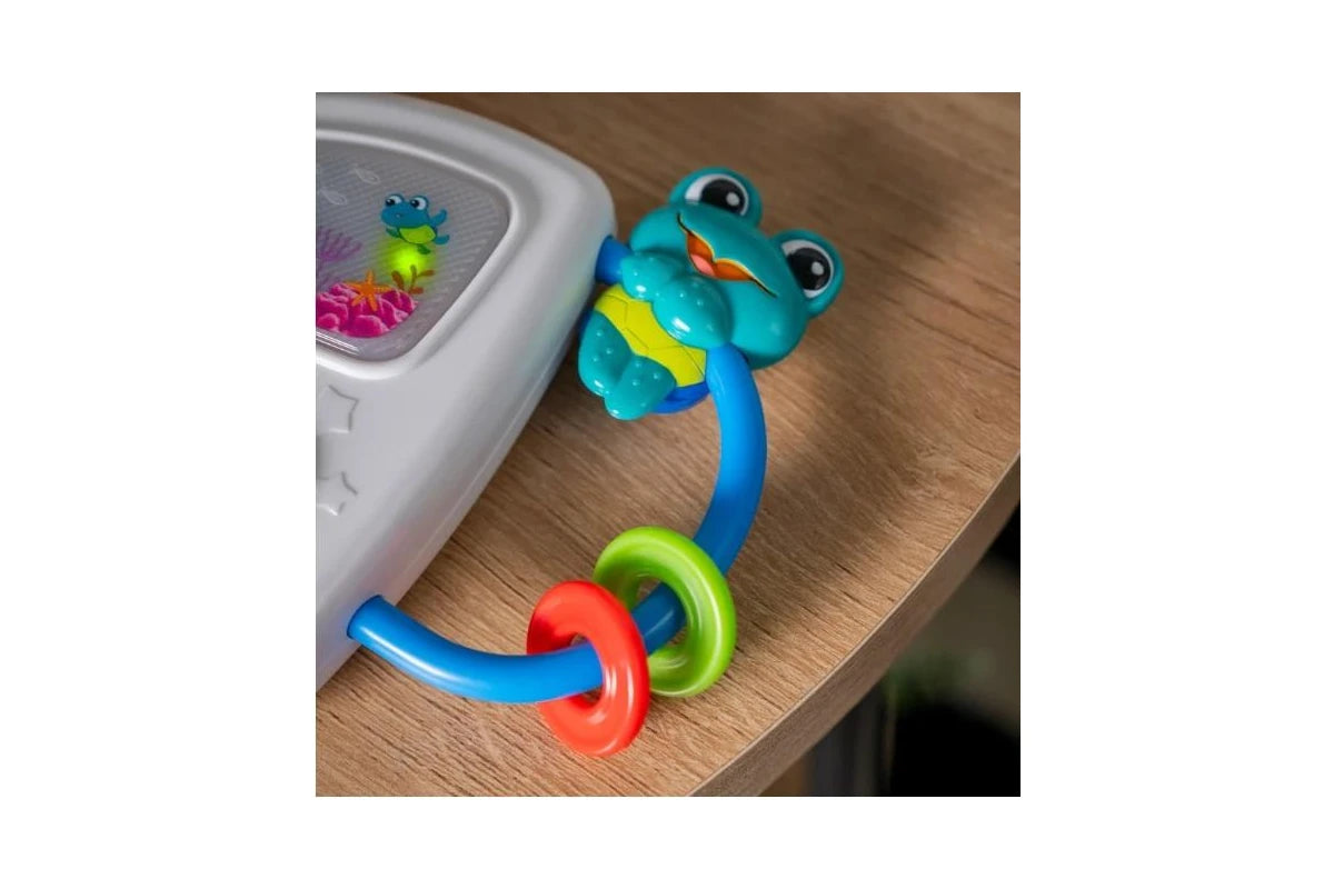 - Easy-grasp handle features Neptune the Turtle character, and lets baby enjoy this engaging toy at home or on-the-go.