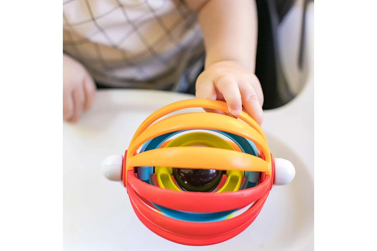 As this table toy spins and swirls, the brightly colored loops will whip up a visually stimulating experience. See baby focus as he curiously watches the inner-ball and loops spin in opposite directions. Those colorful bands are fun to grab and spin, which will help encourage hand-eye coordination and fine motor skills. The powerful suction cup base keeps the spinner in place whenever you need to entertain your squirmy baby. Use it as a high chair toy, or toss it in the diaper bag to have frustration-free play on hand. Your baby’s fascinated little fingers will keep this world of color going round and round!