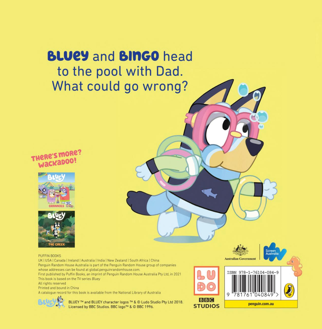 Bluey, Bingo, and Dad head to the pool. What could go wrong? Find out in this beautiful picture book adventure.