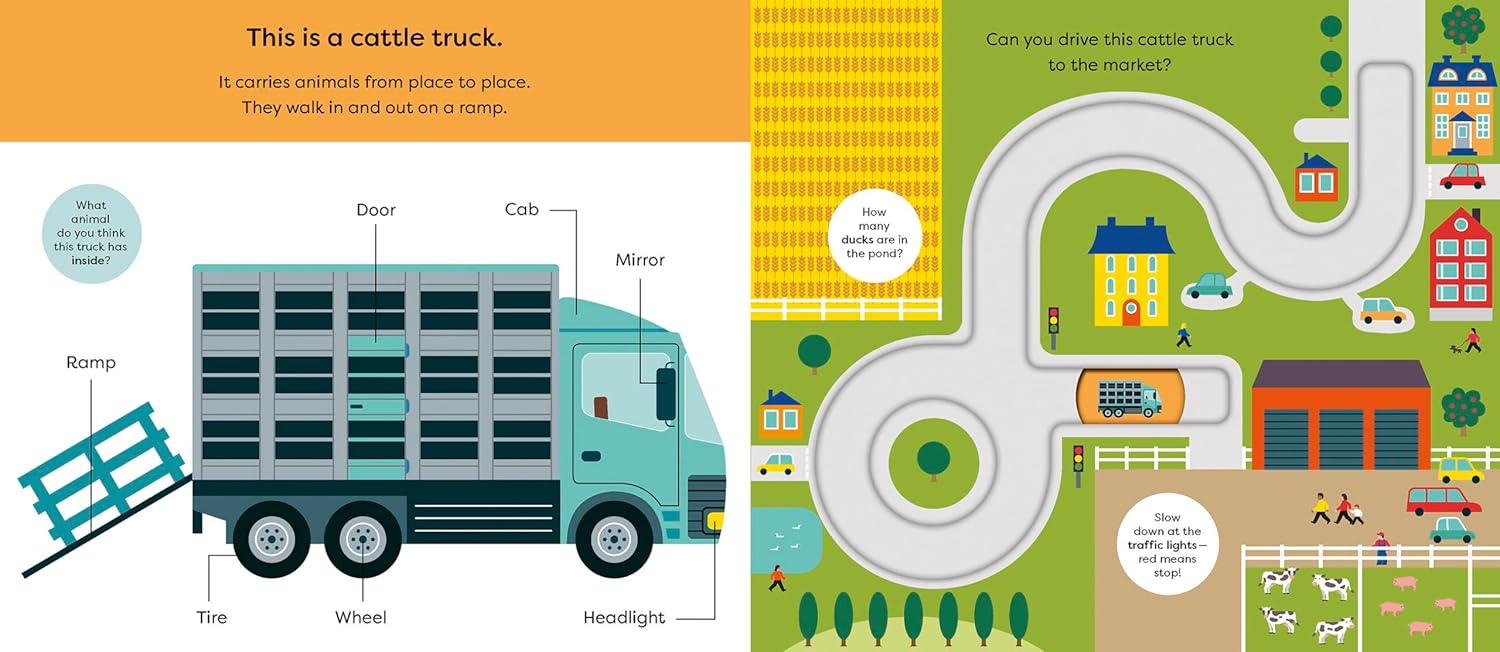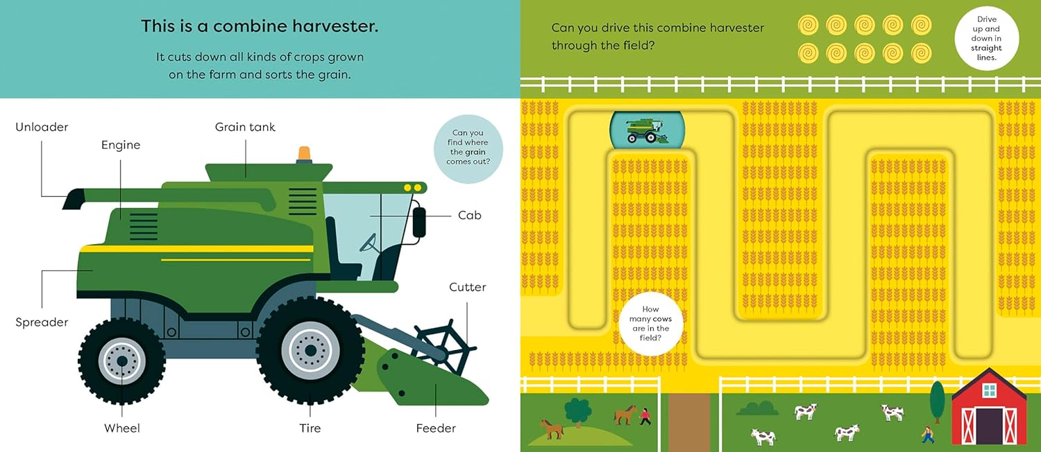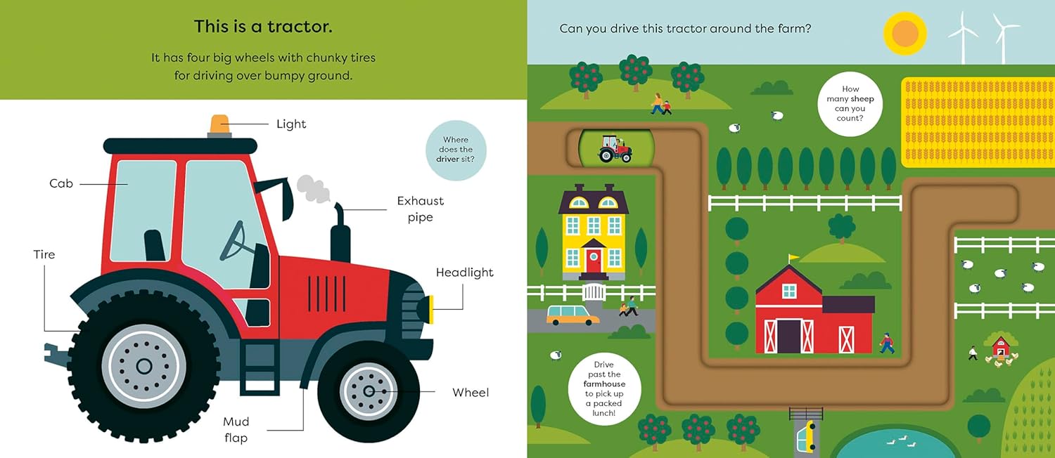 Learn vehicle vocabulary with simple first words, clear diagrams and helpful text prompts to encourage discussion. Then trace the transport around different tracks with a moving counter on every spread and the cover. The perfect book for children who love tractors and combine harvesters – and being in the driving seat!